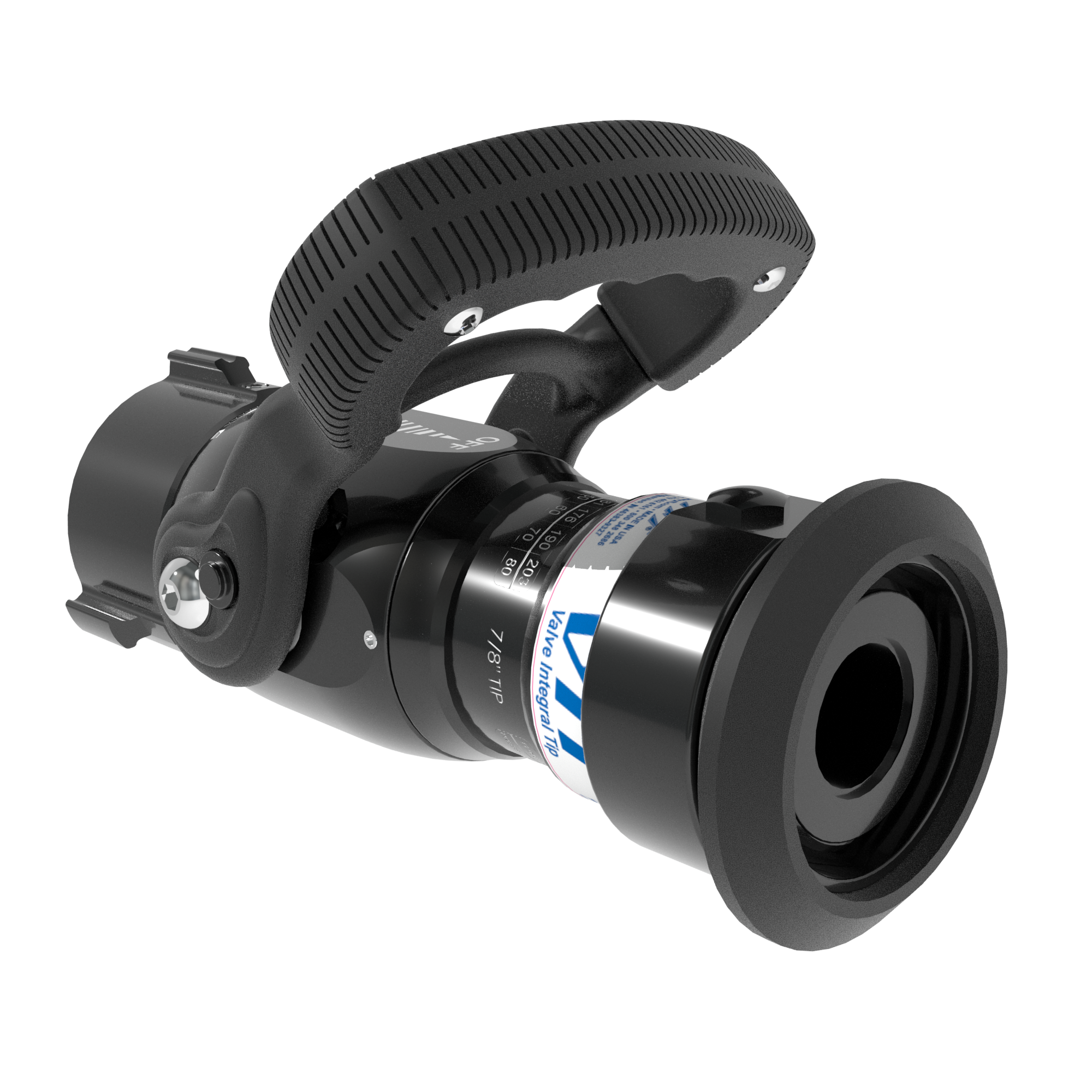 Separate ball-type shutoff valve for use with tip only nozzles. Use the valve as a smooth bore at the selected outlet diameter. Six detent flow positions. Colored handle covers available. 1.5″ NH (38 mm) rocker lug full-time swivel inlet coupling and 1.5″ NH (38 mm) male outlet standard. All lightweight materials are used.
