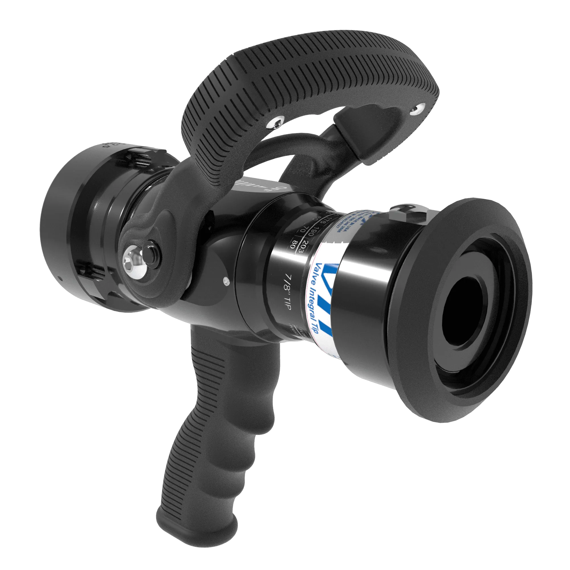 Separate ball-type shutoff valve with built-in pistol grip mounted below valve body for use with tip only nozzles. Use the valve as a smooth bore at the selected outlet diameter. Six detent flow positions. Colored pistol grip and handle covers available. 2.5″ NH (65 mm) rocker lug full-time swivel inlet coupling and 1.5″ NH (38 mm) male outlet standard. All lightweight materials are used.
