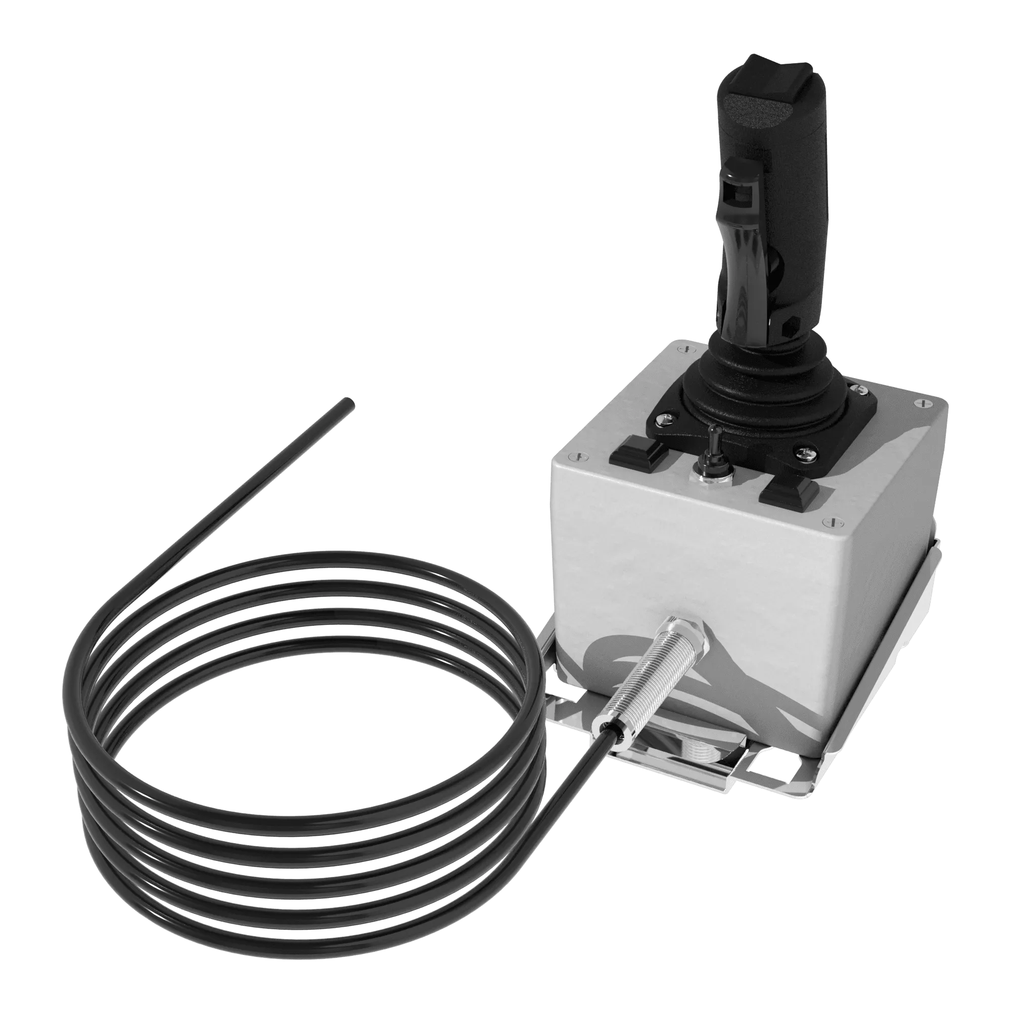 This operator station allows any TFT RC electric monitor to be controlled using a joystick. Moving the joystick controls monitor vertical and horizontal movement. Thumb switches control nozzle pattern. A trigger built into the joystick handle can be used to open and close some water valves. The joystick is factory installed on an enclosure that houses the control electronics and a 10′ (3m) cable is supplied with stripped wires for connection in the control system terminal box. The joystick control is also equipped with push buttons on top for PARK and OSCILLATE functions as well as monitor DEPLOY. An additional configurable button can be set up for RC Extend-A-Gun or LED light kit control. A toggle switch is available to select water valve open, close, or joystick control. The joystick control can be configured for proportional speed control of the horizontal and vertical axis. The joystick control is factory wired so that the AUX2 button on TFT monitor operator stations will also open and close the water valve. Mounting bracket meets NFPA 1900 9G force requirements which ensures the security of equipment and safety of personnel.