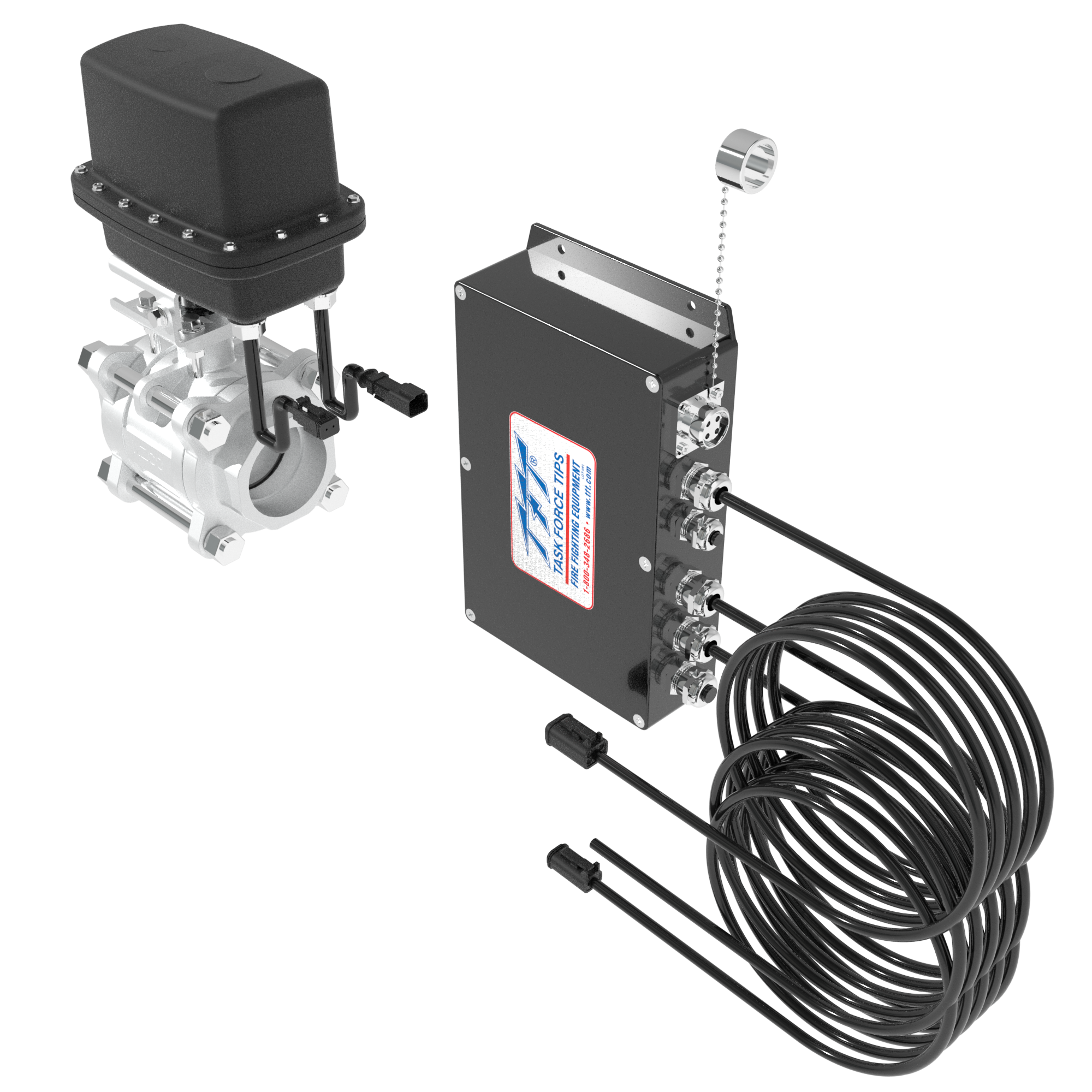 This valve kit includes a heavy-duty 2.5″ NPT (65 mm) water valve and an interface box for simplified 12/24 volt wire connections to the monitor control system. The valve is a 2.5″ NPT (65 mm) full port stainless steel ball valve with integral electric actuator control and cables with pre-wired plugs.